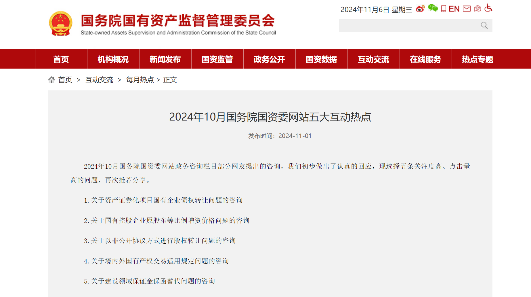 近日,國務(wù)院國資委對2024年10月官網(wǎng)政務(wù)咨詢欄目部分網(wǎng)友提出的咨詢,初步作出了回應(yīng),并選取了5條關(guān)注度高、點擊量高的問題,再次推薦分享。
