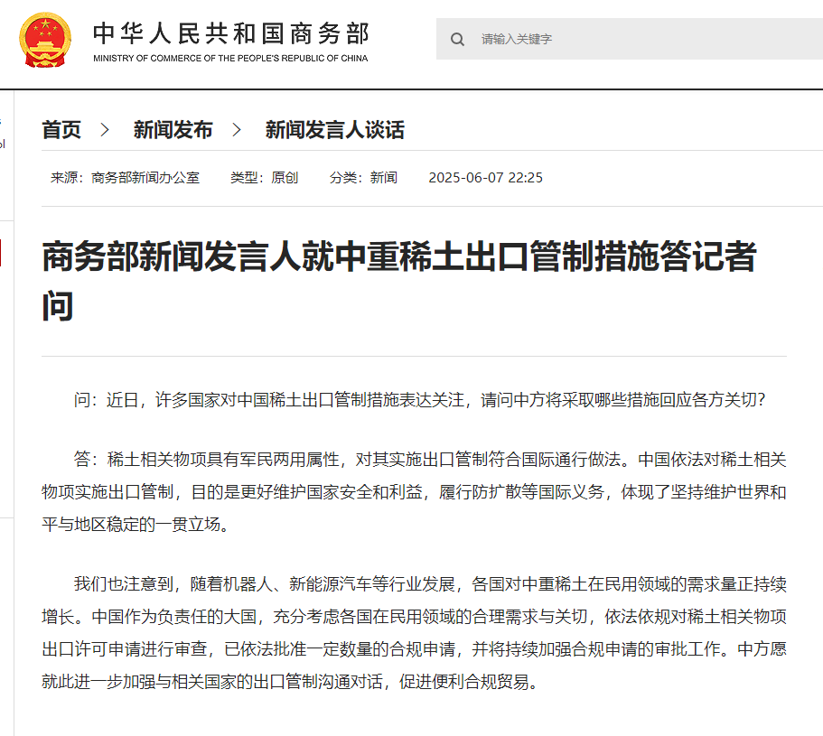 我們也注意到,隨著機(jī)器人、新能源汽車等行業(yè)發(fā)展,各國對中重稀土在民用領(lǐng)域的需求量正持續(xù)增長。中國作為負(fù)責(zé)任的大國,充分考慮各國在民用領(lǐng)域的合理需求與關(guān)切,依法依規(guī)對稀土相關(guān)物項(xiàng)出口許可申請進(jìn)行審查,已依法批準(zhǔn)一定數(shù)量的合規(guī)申請,并將持續(xù)加強(qiáng)合規(guī)申請的審批工作。中方愿就此進(jìn)一步加強(qiáng)與相關(guān)國家的出口管制溝通對話,促進(jìn)便利合規(guī)貿(mào)易。