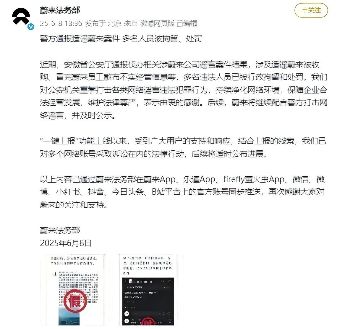 以上內(nèi)容已通過蔚來法務(wù)部在蔚來App、樂道App、firefly螢火蟲App、微信、微博、小紅書、抖音、今日頭條、B站平臺上的官方賬號同步推送,再次感謝大家對蔚來的關(guān)注和支持。