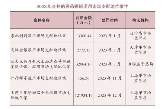 去年6月,根據(jù)市場監(jiān)管總局(國家反壟斷局)發(fā)布的《中國反壟斷執(zhí)法年度報告(2023)》,醫(yī)藥領(lǐng)域共查處濫用市場支配地位案件5件,罰沒金額合計17.02億元。其中4起都為原料藥市場壟斷,另外1起為短缺藥不公平高價行為壟斷調(diào)查案件。