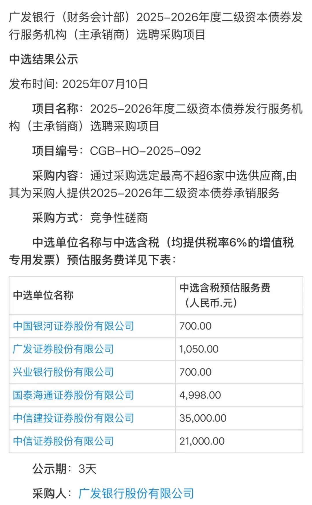 7月10日,廣發(fā)銀行對上述項目中選結果進行公示,中國銀河證券、廣發(fā)證券、興業(yè)銀行、國泰海通證券、中信建投證券、中信證券等6家機構中選,承銷服務費總額63448元,提供稅率6%的增值稅專用發(fā)票。