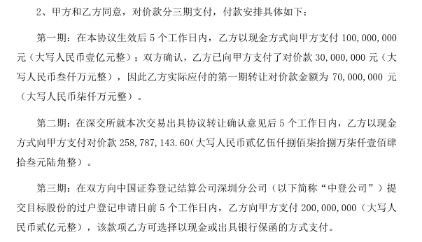對(duì)價(jià)款分三期支付。第一期在本協(xié)議生效后5個(gè)工作日內(nèi),福州千景以現(xiàn)金方式向天凱匯達(dá)支付1億元;雙方確認(rèn),福州千景已向天凱匯達(dá)支付了對(duì)價(jià)款3000萬元,因此福州千景實(shí)際應(yīng)付的第一期轉(zhuǎn)讓對(duì)價(jià)款金額為7000萬元。第二期在深交所就本次交易出具協(xié)議轉(zhuǎn)讓確認(rèn)意見后5個(gè)工作日內(nèi),福州千景以現(xiàn)金方式向天凱匯達(dá)支付對(duì)價(jià)款2.59億元。第三期在雙方向中國(guó)證券登記結(jié)算公司深圳分公司提交目標(biāo)股份的過戶登記申請(qǐng)日前5個(gè)工作日內(nèi),福州千景向天凱匯達(dá)支付2億元,可選擇以現(xiàn)金或出具銀行保函的方式支付。