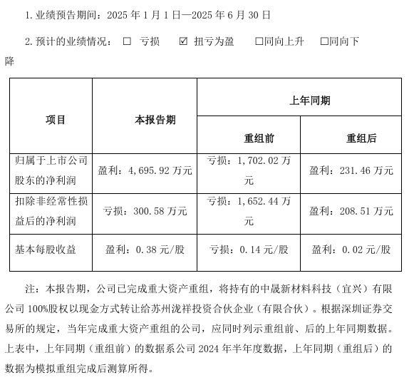 公司稱,公司實(shí)施完成重大資產(chǎn)重組,將持有的中晟新材料科技(宜興)有限公司100%股權(quán)以現(xiàn)金方式轉(zhuǎn)讓給蘇州瀧祥投資合伙企業(yè)(有限合伙),產(chǎn)生投資收益4846.38萬元。公司環(huán)保板塊上半年工程結(jié)算收入較少,導(dǎo)致扣除非經(jīng)常性損益后歸屬于上市公司股東的凈利潤(rùn)為負(fù)數(shù)。