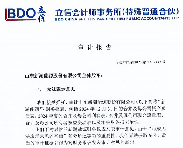 值得關(guān)注的是,因未能按時(shí)披露定期報(bào)告,*ST新潮股票自5月6日起停牌,并引發(fā)證監(jiān)會(huì)立案調(diào)查。在經(jīng)歷數(shù)月的加急審計(jì)后,立信會(huì)計(jì)師事務(wù)所7月5日完成了ST新潮2024年年報(bào)及2025年一季報(bào)的審計(jì)。然而,立信對(duì)財(cái)務(wù)報(bào)告和內(nèi)部控制均出具了“無法表示意見”的審計(jì)結(jié)論。