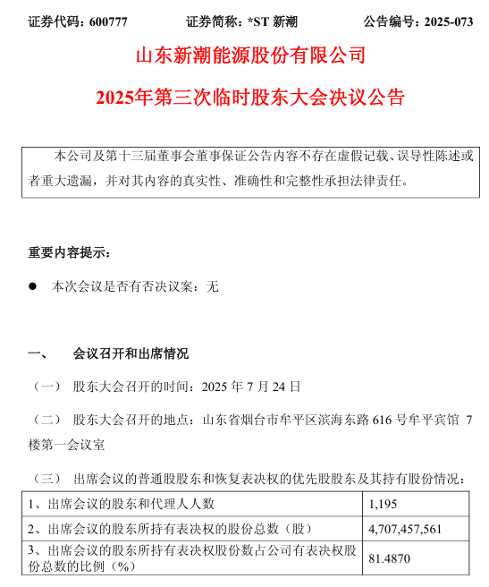 7月24日下午,*ST新潮臨時(shí)股東大會(huì)在山東煙臺(tái)牟平賓館召開。此次股東大會(huì)是在新晉第一大股東伊泰B股向現(xiàn)任董監(jiān)事會(huì)提出“提前換屆”訴求屢次遭拒后,由6位中小股東自行召集舉行的。這也是2025年A股上市公司中首例由中小股東自行召集的股東大會(huì)。