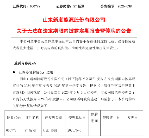 4月30日,公司披露關(guān)于無法在法定期限內(nèi)披露定期報(bào)告暨停牌的公告。按照相關(guān)規(guī)定,公司在股票停牌后兩個(gè)月內(nèi)仍未披露2024年年度報(bào)告的,將被實(shí)施退市風(fēng)險(xiǎn)警示;如公司股票交易被實(shí)施退市風(fēng)險(xiǎn)警示之日起兩個(gè)月內(nèi)仍未披露過半數(shù)董事保證真實(shí)性、準(zhǔn)確性和完整性的2024年年度報(bào)告,公司股票將被終止上市。