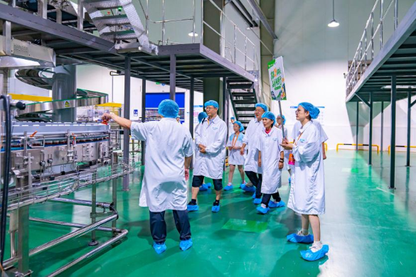 在生產(chǎn)車間,各類先進生產(chǎn)線有序運轉(zhuǎn),展現(xiàn)出現(xiàn)代化飲品生產(chǎn)的嚴謹與高效。工作人員詳細介紹了“潤家”飲料從原料生產(chǎn)、運輸,到配方研發(fā)、灌裝生產(chǎn)的全流程品控環(huán)節(jié)。從優(yōu)質(zhì)原料的嚴格篩選,到運輸過程中的保鮮措施,再到配方研發(fā)時對健康元素的精準把控,以及超高溫滅菌黑科技、全程無菌灌裝、多道質(zhì)檢程序,每一個細節(jié)都體現(xiàn)著對飲品品質(zhì)的極致追求。