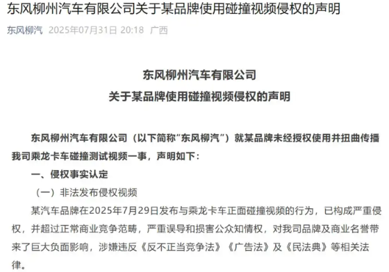 東風柳汽表示,某汽車品牌在2025年7月29日發(fā)布與乘龍卡車正面碰撞視頻的行為,已構(gòu)成嚴重侵權(quán),并超過正常商業(yè)競爭范疇,嚴重誤導和損害公眾知情權(quán),對東風柳汽品牌及商業(yè)名譽帶來了巨大負面影響,涉嫌違反《反不正當競爭法》《廣告法》及《民法典》等相關(guān)法律。