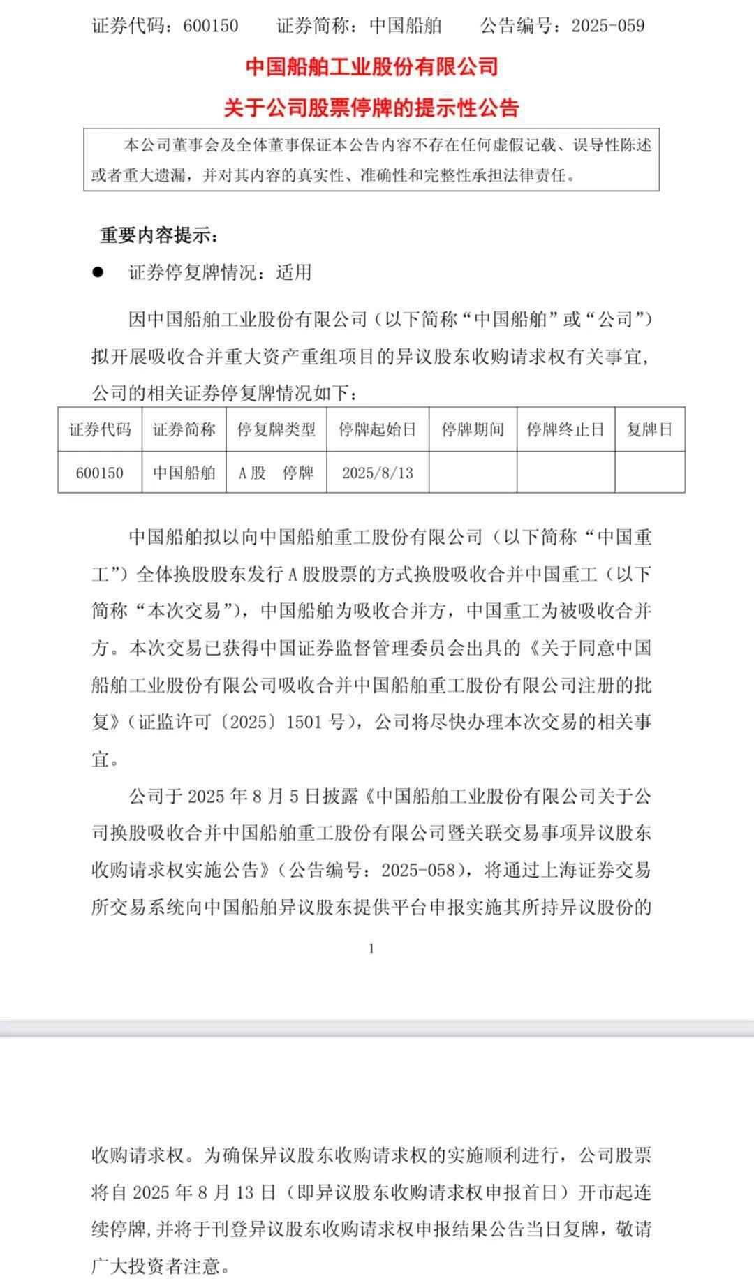 8月4日晚間,中國船舶發(fā)布公告稱,公司擬開展吸收合并重大資產重組項目的異議股東收購請求權有關事宜,公司股票將自2025年8月13日開市起連續(xù)停牌,并將于刊登異議股東收購請求權申報結果公告當日復牌。