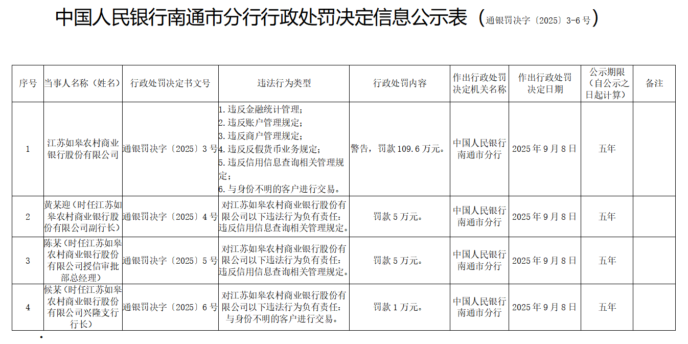 9月16日,中國人民銀行江蘇省分行網(wǎng)站發(fā)布的一則行政處罰信息顯示,江蘇如皋農(nóng)村商業(yè)銀行股份有限公司(以下簡稱“如皋農(nóng)商銀行”)因存在多項業(yè)務(wù)違規(guī)行為,被中國人民銀行南通市分行給予警告,并處以109.6萬元罰款。同時,該行3名相關(guān)責(zé)任人也受到處罰。
