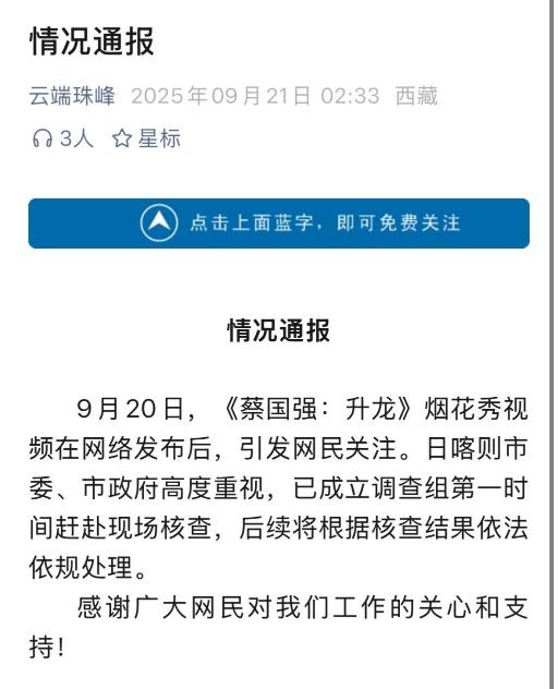 9月21日,“云端珠峰”微信公眾號發(fā)布情況通報指出,日喀則市委、市政府高度重視,已成立調查組第一時間趕赴現(xiàn)場核查,后續(xù)將根據(jù)核查結果依法依規(guī)處理。