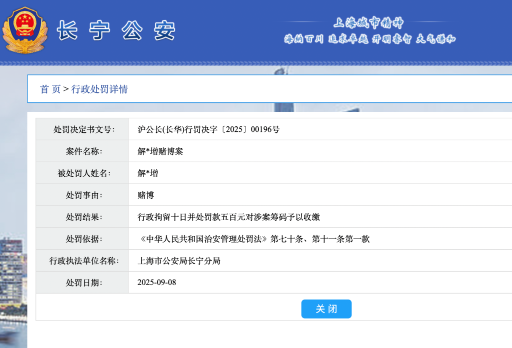 上海市公安局長(zhǎng)寧分局官網(wǎng)公開的行政處罰信息顯示,9月8日,一位姓名為“解某增”的人員因參與賭博被上海市警方帶走,處罰結(jié)果為“行政拘留十日,并處罰款五百元,對(duì)涉案籌碼予以收繳”。