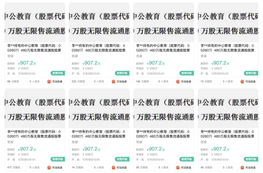 阿里資產(chǎn)司法平臺顯示,上述4800萬股股份被分為10個標(biāo)的,每一個標(biāo)的物“李**持有的中公教育(股票代碼:002607)480萬股無限售流通股股票”的起拍價為907.2萬元。