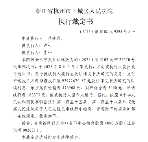根據(jù)司法拍賣平臺披露的浙江省杭州市上城區(qū)人民法院執(zhí)行裁定書,法院依據(jù)已經(jīng)發(fā)生法律效力的(2024)浙0102民初25570號民事判決書,于2025年8月5日立案執(zhí)行,并向被執(zhí)行人發(fā)出執(zhí)行通知書,責(zé)令被執(zhí)行人履行生效法律文書所確定的義務(wù):支付申請執(zhí)行人蔣秀霞執(zhí)行款92972670.67元及法律文書所確定的后續(xù)利息,承擔(dān)案件受理費(fèi)476908元、財(cái)產(chǎn)保全費(fèi)5000元、申請執(zhí)行費(fèi)160373元,但被執(zhí)行人至今未履行。據(jù)此,依照《中華人民共和國民事訴訟法》第二百五十五條、第二百五十八條和《最高人民法院關(guān)于人民法院民事執(zhí)行中拍賣、變賣財(cái)產(chǎn)的規(guī)定》第一條的規(guī)定,裁定拍賣、變賣被執(zhí)行人名下中公教育股票4800萬股(證券代碼002607)。