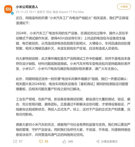 11月23日,小米公司發(fā)言人微博發(fā)文,對(duì)近日網(wǎng)傳“小米汽車工廠內(nèi)電池產(chǎn)線起火” 進(jìn)行回應(yīng),原文如下: