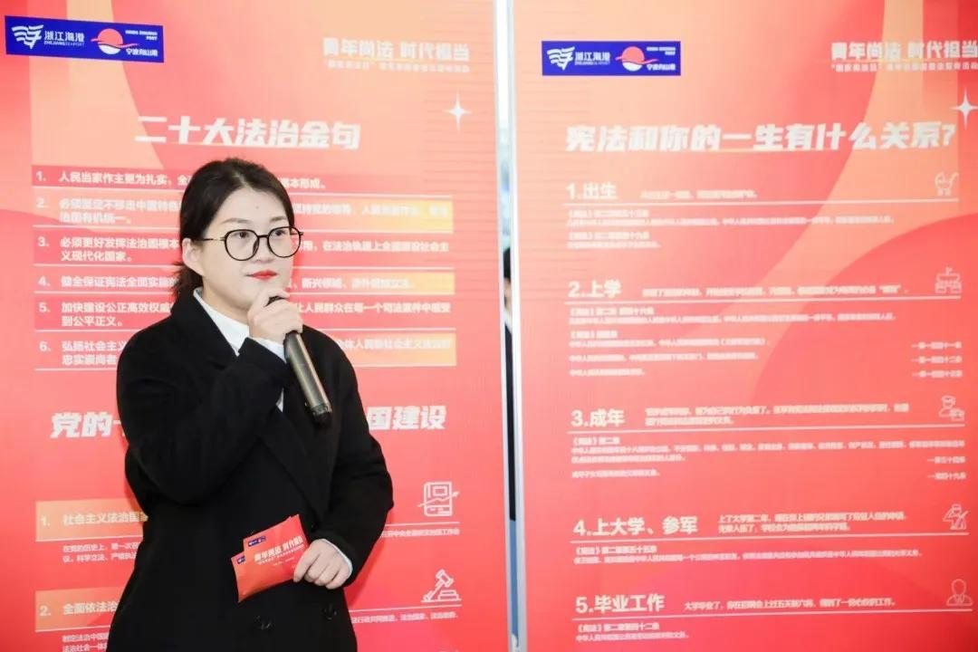 活動現(xiàn)場特別設(shè)置了憲法授課、憲法飛行棋、法律連連看、“法”影重重、法律問答、合規(guī)分分樂等六個法律主題趣味互動區(qū)域,通過“學憲集章”打卡的形式,引導參與者在參觀中學習、在互動中領(lǐng)悟,現(xiàn)場學習氛圍濃厚。憲法館講解員與集團普法志愿者也同步在現(xiàn)場向廣大群眾開展憲法法治和海港法治建設(shè)實踐宣傳。
