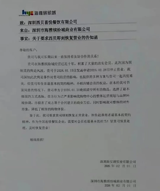 該告知函顯示,因為預制菜的輿論風波,西貝喜悅餐飲于2026年1月15日向海雅繽紛城發(fā)函,申請2026年2月28日停止營業(yè)。為一起度過難關,該商城提供了多種方案給西貝喜悅餐飲。但“在未經我司書面同意的情況下,貴司單方于2026年1月31日晚欲清空所有的物品,選擇了最不體面的方式逃場”。界面新聞注意到,該告知函沒有蓋章。