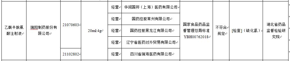 通告顯示,經(jīng)湖北省藥品監(jiān)督檢驗研究院檢驗,標(biāo)示為瑞陽制藥股份有限公司生產(chǎn)的2批次乙酰半胱氨酸注射液(批號:21070603、21102802)不符合規(guī)定,不符合規(guī)定項目為硫化氫。