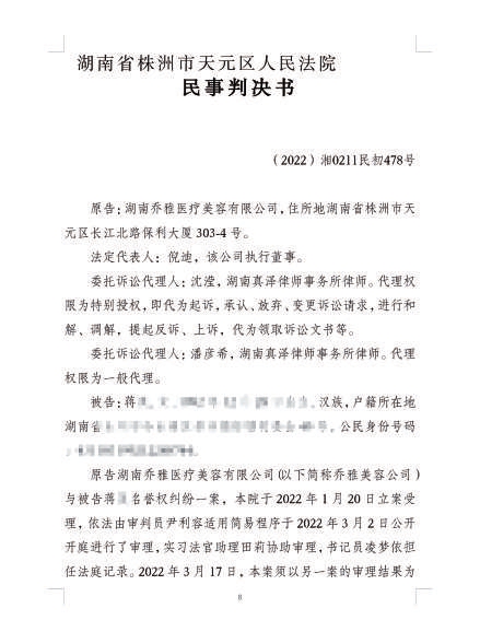 正因?yàn)槭Y娟娟對(duì)美容機(jī)構(gòu)提起了訴訟,在其尚未審結(jié)期間,美容機(jī)構(gòu)訴蔣娟娟案一度中止審理。2022年10月8日,株洲市天元區(qū)人民法院恢復(fù)審理此案,并于同年10月12日公開(kāi)開(kāi)庭進(jìn)行了審理。