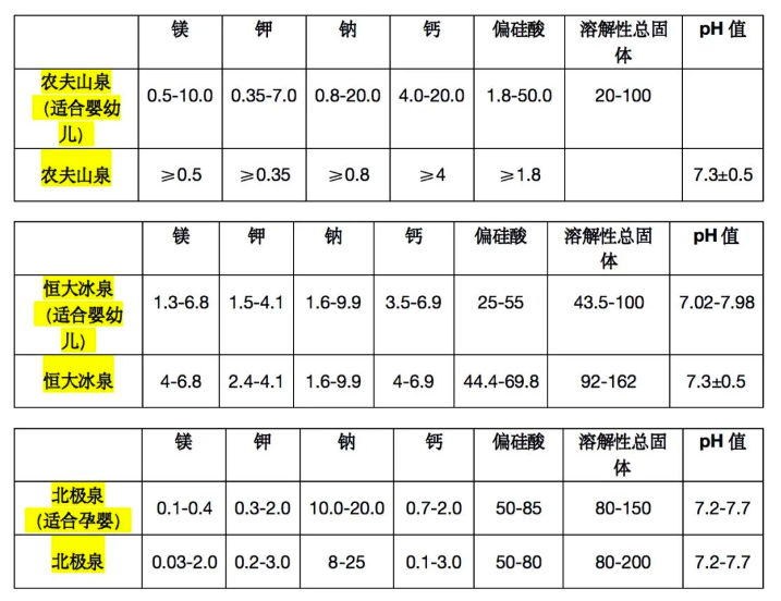 結(jié)果發(fā)現(xiàn),兩者的成分含量并沒(méi)有顯著的區(qū)別。如農(nóng)夫山泉(適合嬰幼兒)標(biāo)注鎂含量為0.5-10.0,鉀含量為0.35—7.0,鈉含量為0.8—20.0,鈣含量為4.0—20.0,偏硅酸為1.8—50.0;而農(nóng)夫山泉普通飲用水標(biāo)注鎂含量為≥0.5,鉀含量為≥0.35,鈉含量為≥0.8,鈣含量為≥4,偏硅酸為≥1.8。