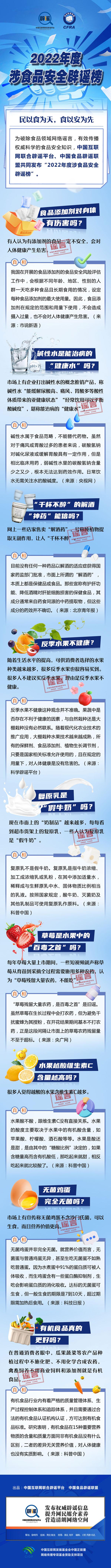 民以食為天,食以安為先。食品安全關(guān)系到人民群眾的身體健康和生命安全,受到全社會高度關(guān)注。為破除食品領(lǐng)域網(wǎng)絡(luò)謠言,有效傳播權(quán)威科學(xué)的食品安全知識,中國互聯(lián)網(wǎng)聯(lián)合辟謠平臺、中國食品辟謠聯(lián)盟共同發(fā)布“2022年度涉食品安全辟謠榜”,讓我們一起對食品安全謠言說不!