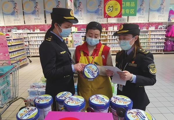 今年2月,嬰幼兒奶粉“新國(guó)標(biāo)”——3項(xiàng)強(qiáng)制性國(guó)家標(biāo)準(zhǔn)正式實(shí)施。連日來(lái),浙江省湖州市長(zhǎng)興縣市場(chǎng)監(jiān)管局對(duì)轄區(qū)內(nèi)大型商超、母嬰用品店進(jìn)行全面檢查,督促各單位落實(shí)明碼標(biāo)價(jià),把好食品安全主體責(zé)任關(guān)。圖為該局執(zhí)法人員正在對(duì)轄區(qū)內(nèi)一家商超進(jìn)行檢查。