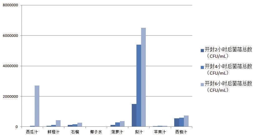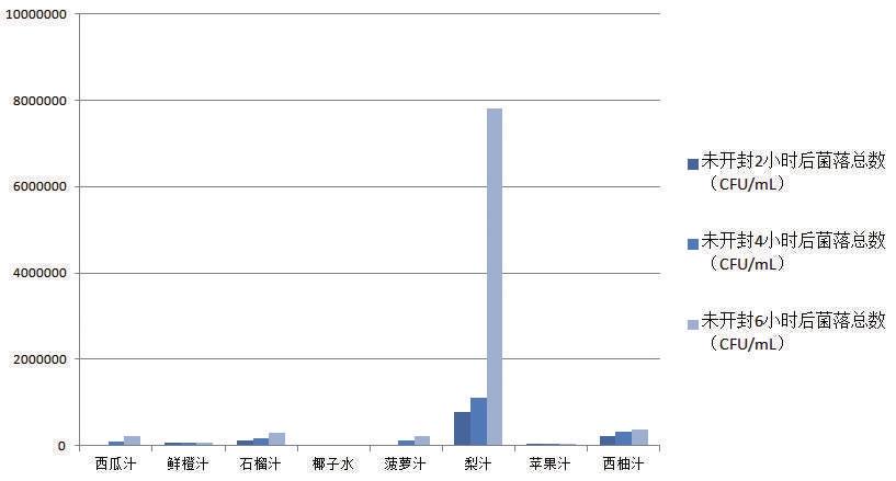 以鮮水果壓榨工藝制作的果汁,即鮮榨果汁,在開封喝過2小時后,有的菌落總數(shù)已經(jīng)超過國家標準規(guī)定限量,最高的一款梨汁達到了1500000CFU/ mL。其余未超過限量的鮮榨果汁,其菌落總數(shù)也隨著時間大量繁殖。開封喝過4小時、6小時后,大部分鮮榨果汁的菌落總數(shù)超過了國家標準規(guī)定限量的范圍,增長速度最快的一款西瓜汁在開封6小時后菌落總數(shù)與開封2小時數(shù)據(jù)相比增長了近586倍。