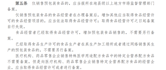 《辦法》規(guī)定,僅銷售預包裝食品,不需要取得食品經(jīng)營許可。特殊食品屬于預包裝食品,作為經(jīng)營戶,如果銷售包括特殊食品在內(nèi)的預包裝食品,那么需要格外關注《辦法》的第五條、第六章。作為僅銷售預包裝食品備案的專門條款和章節(jié),它們明確了備案范圍、備案主體資質(zhì)要求和備案信息公示等內(nèi)容。