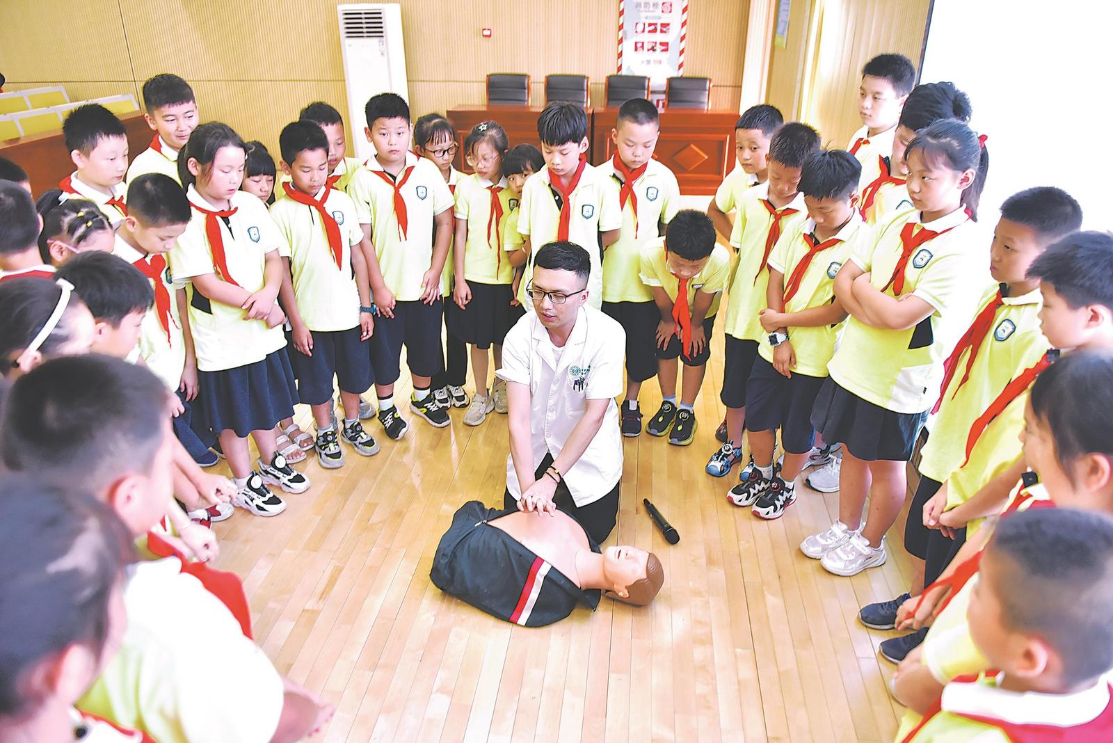 9月9日是2023年“世界急救日”。9月6日,合肥市振興小學(xué)開展“應(yīng)急救護進校園”活動,邀請合肥市蜀山區(qū)健康巡講專家現(xiàn)場向師生傳授應(yīng)急救護技能和自動體外除顫器的使用技巧等,普及急救知識。 通訊員 葛宜年 攝