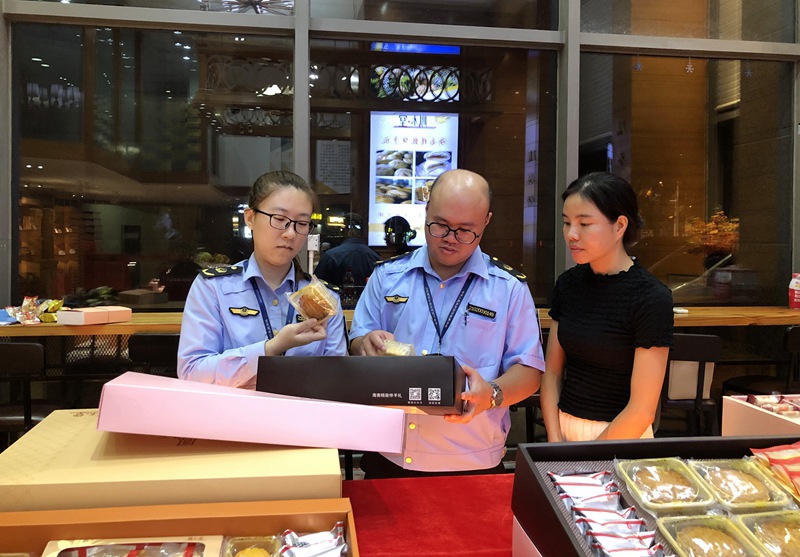 市場監(jiān)督管理局工作人員正在銷售店內(nèi)檢查月餅包裝情況。海南省市場監(jiān)督管理局供圖