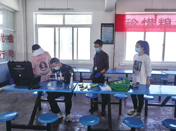 圖為華亭市策底鎮(zhèn)市場監(jiān)管部門執(zhí)法人員在轄區(qū)一所學(xué)校餐廳對抽樣的食材進(jìn)行現(xiàn)場快檢。于紅霞 史安良 文/攝