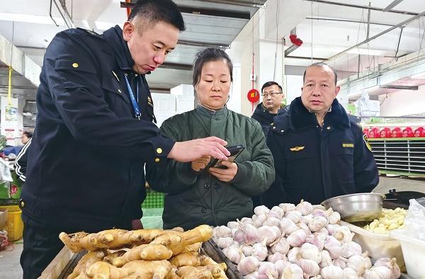 圖為聯(lián)合執(zhí)法人員針對(duì)本地風(fēng)險(xiǎn)突出的重點(diǎn)農(nóng)產(chǎn)品生姜進(jìn)行重點(diǎn)檢查。本報(bào)記者 喬燕強(qiáng) 攝