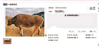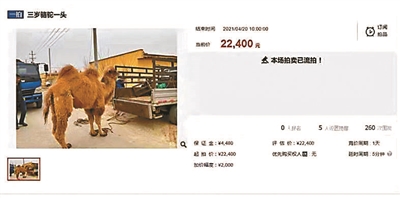 今年4月19日12時(shí),新疆維吾爾自治區(qū)木壘哈薩克自治縣人民法院在阿里拍賣平臺(tái)上對一頭3歲的駱駝和一頭5歲的土牛進(jìn)行拍賣。駱駝的起拍價(jià)格為22400元,土牛的起拍價(jià)格為18000元。截至2021年4月20日12時(shí),兩只活物標(biāo)的物最終流拍。