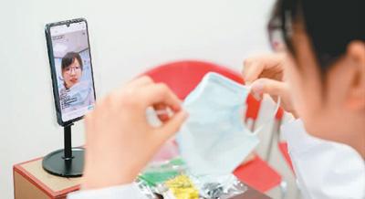 在上海市黃浦區(qū)打浦橋街道社區(qū)衛(wèi)生服務(wù)中心,家庭醫(yī)生在直播中與居民就戴口罩的問(wèn)題進(jìn)行互動(dòng)。新華社記者 劉 穎攝