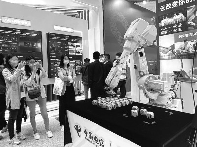 5月17日,2021年世界電信和信息社會日大會上,人們正在圍觀一款5G工業(yè)機(jī)器人。本報記者 劉坤攝/光明圖片