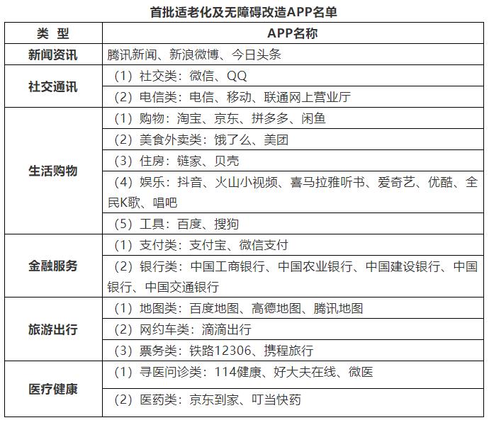 《方案》要求,開展老年人、殘疾人常用移動互聯(lián)網(wǎng)應(yīng)用(APP)的適老化及無障礙改造。立足老年人、殘疾人的實際生活體驗,豐富滿足其需求的移動互聯(lián)網(wǎng)應(yīng)用種類和功能,對《工業(yè)和信息化部中國殘疾人聯(lián)合會關(guān)于推進(jìn)信息無障礙的指導(dǎo)意見》中列出的移動互聯(lián)網(wǎng)應(yīng)用十大領(lǐng)域、注冊用戶數(shù)超過5000萬人、同類產(chǎn)品中市場份額排名前5名的APP進(jìn)行適老化及無障礙改造。首批優(yōu)先推動新聞資訊、社交通訊、生活購物、金融服務(wù)、旅游出行、醫(yī)療健康等6大類、共43個APP進(jìn)行適老化及無障礙改造。中國信息通信研究院協(xié)助各互聯(lián)網(wǎng)企業(yè),在開發(fā)設(shè)計移動互聯(lián)網(wǎng)應(yīng)用(APP)的過程中落實信息無障礙有關(guān)標(biāo)準(zhǔn)的要求,并將無障礙優(yōu)化納入產(chǎn)品及服務(wù)的日常維護(hù)流程。