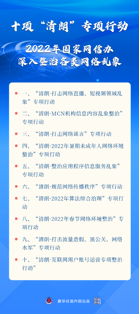 “實(shí)踐證明,開展‘清朗’系列專項(xiàng)行動,集中整治各類網(wǎng)絡(luò)亂象,是網(wǎng)絡(luò)生態(tài)治理的重要方式,也是維護(hù)億萬網(wǎng)民精神家園的有效手段?!眹揖W(wǎng)信辦副主任盛榮華在會上表示,2022年“清朗”系列專項(xiàng)行動將聚焦影響面廣、危害性大的問題開展整治,做到“三個更加突出”,即更加突出回應(yīng)網(wǎng)民關(guān)切,更加突出對癥下藥,更加突出效果導(dǎo)向。