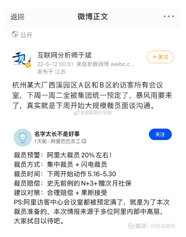 隨后,認(rèn)證為阿里巴巴員工的一名脈脈用戶發(fā)布“裁員預(yù)警”,其稱阿里將大裁員20%左右,裁員賠償是史無前例的N+3并贈(zèng)次月社保。該員工也透露,“阿里訪客中心的會議室都被預(yù)定滿了,就是為了本次裁員準(zhǔn)備的,本次情報(bào)來源于多位阿里內(nèi)部中高層?!?/p>