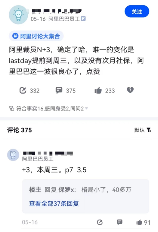 有阿里員工發(fā)文稱,“今天被約談了,這周五走N+3,緩沖29天是N+1,去年的校招生,目前手里沒offer,正在面試”。該員工還糾結(jié)是再待一個(gè)月還是拿n+3走人。還有員工發(fā)文證實(shí)阿里裁員N+3,并稱和之前流傳消息不同的是,最后期限提前到周三以及沒有次月社保。