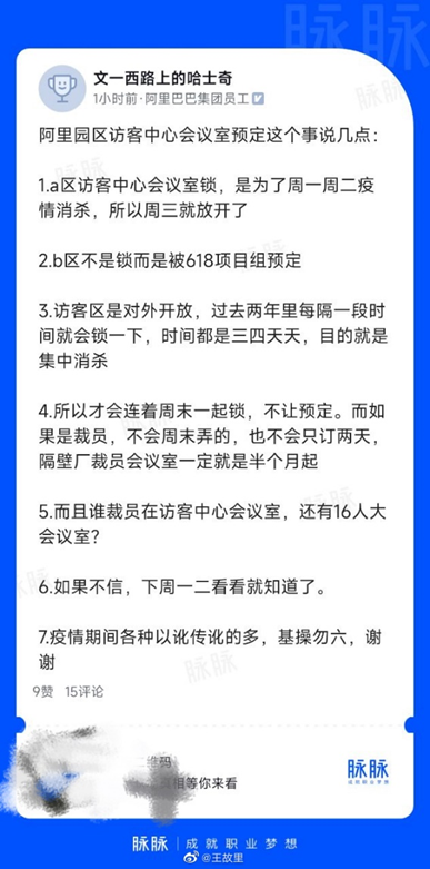 針對上述爆料,另一阿里員工當(dāng)天在脈脈發(fā)布長文回應(yīng)稱,A區(qū)訪客中心會議室被鎖是為了疫情消殺,B區(qū)是被618項(xiàng)目組預(yù)定,訪客區(qū)是對外開放的,過去兩年里每隔一段時(shí)間就會因集中消殺而封鎖,時(shí)間都是三四天。