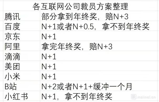 該員工還曬出一份“各互聯(lián)網(wǎng)公司裁員方案整理”的表格,根據(jù)該表,相比其它幾家大廠,阿里的“拿完年終獎(jiǎng),賠N+3”方案如該員工所說“還算良心”。