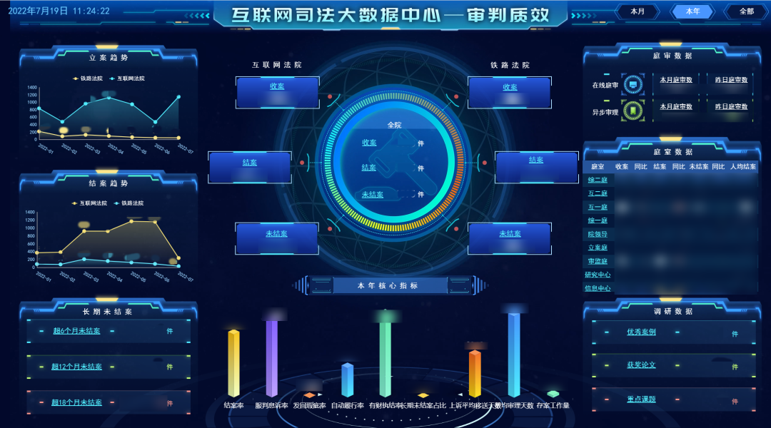 互聯(lián)網(wǎng)司法數(shù)智大腦構(gòu)建了法院的數(shù)字畫像,實(shí)現(xiàn)實(shí)體法院與虛擬法院之間的虛實(shí)映射、實(shí)時(shí)交互和全生命周期管理。系統(tǒng)通過審判質(zhì)效、執(zhí)行質(zhì)效、當(dāng)事人畫像等8個(gè)維度,運(yùn)用時(shí)間、地域、主體、案由、標(biāo)的、行業(yè)等動(dòng)態(tài)模型對(duì)數(shù)據(jù)進(jìn)行綜合分析應(yīng)用,支持對(duì)案件、法官、當(dāng)事人等信息進(jìn)行最小顆粒度精準(zhǔn)搜索,一屏總覽全院動(dòng)態(tài),一鍵直達(dá)數(shù)據(jù)底層。