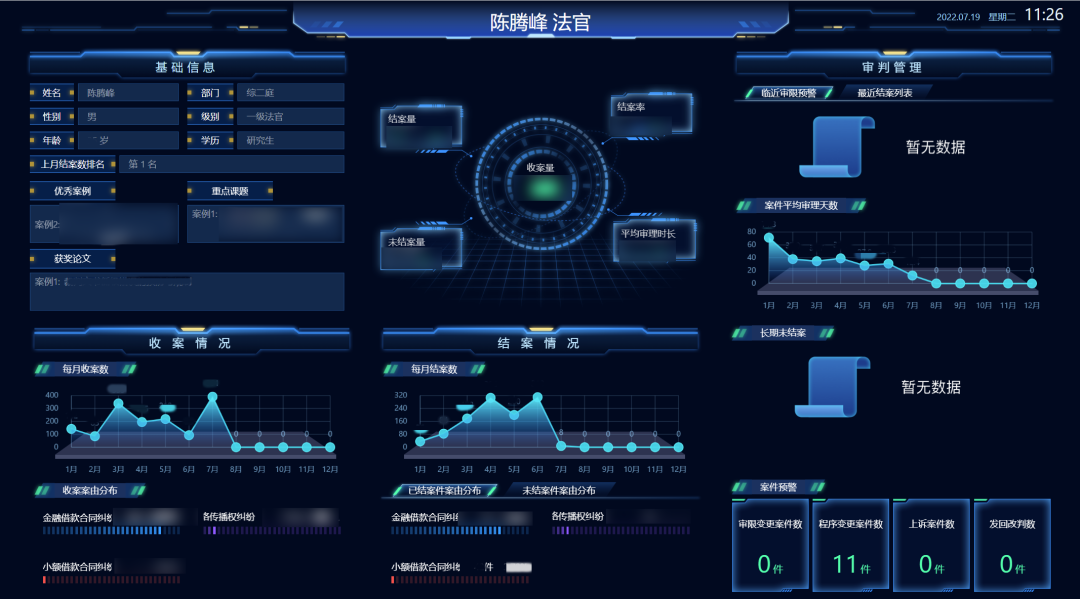 法官數(shù)字畫像對(duì)法官的數(shù)據(jù)進(jìn)行歸集和細(xì)化,從個(gè)人信息、調(diào)研和案例、收結(jié)案情況、辦案質(zhì)效、案件類型、審限預(yù)警、辦案習(xí)慣、案件預(yù)警等維度對(duì)法官進(jìn)行了完整畫像和能力分析?;诋嬒窈湍芰Φ姆治?,通過模型算法的構(gòu)建,在分案中進(jìn)行科學(xué)化精細(xì)化管理,對(duì)短板進(jìn)行精準(zhǔn)化補(bǔ)強(qiáng),同時(shí)自動(dòng)打造出“千人千面”的法官工作臺(tái),幫助法官解決在辦案過程中遇到的各個(gè)難點(diǎn)、堵點(diǎn)和痛點(diǎn)。