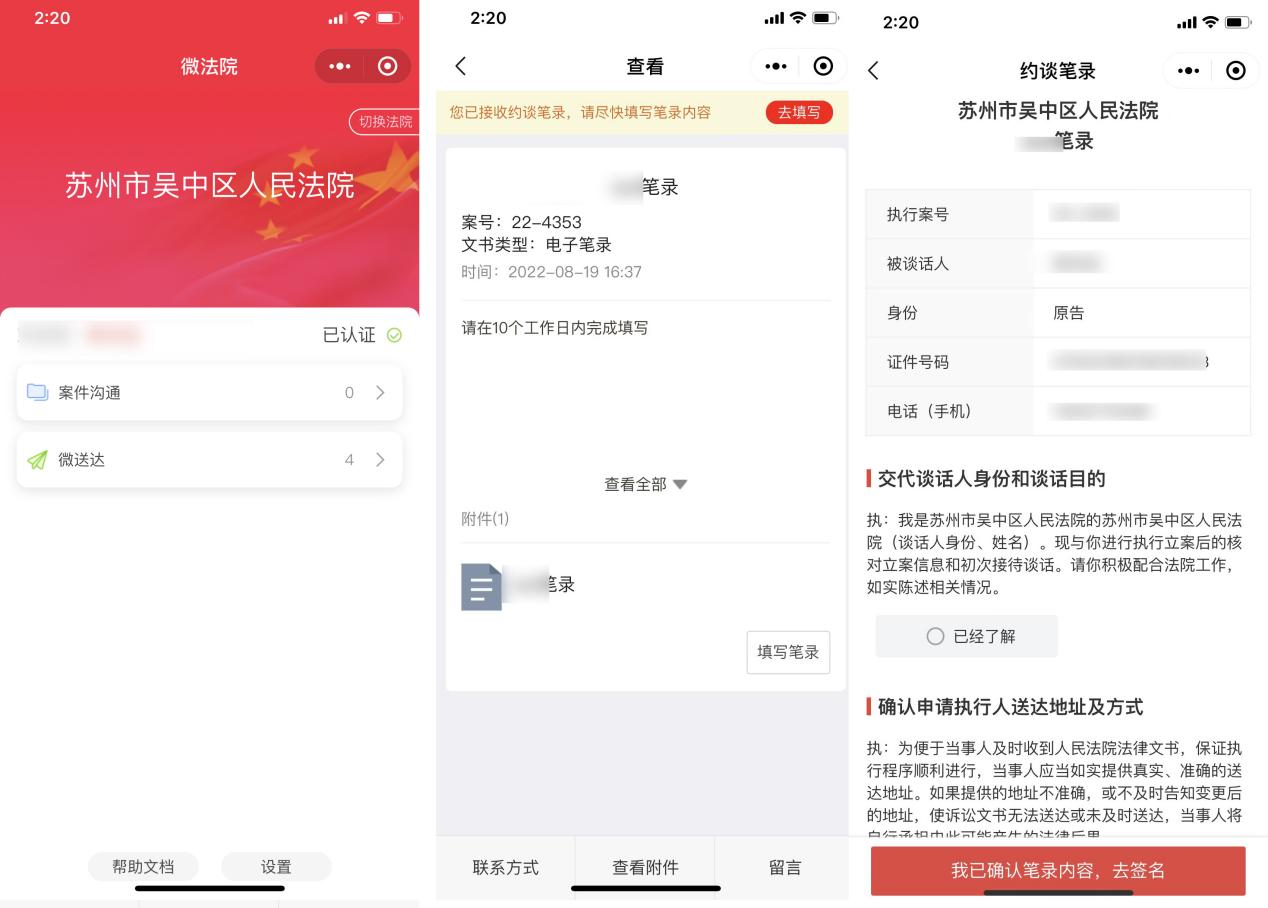 在這樣的背景下,蘇州吳中法院與京東拍賣達(dá)成合作?;趨侵蟹ㄔ簝?yōu)化初次接待執(zhí)行的需求,京東拍賣成立專項(xiàng)工作小組,充分發(fā)揮京東自身的技術(shù)和資源能力,耗時(shí)2個(gè)月進(jìn)行系統(tǒng)研發(fā)與調(diào)試,于8月19日正式上線“初次接待談話筆錄”小程序,這也讓蘇州吳中法院成為全國首個(gè)將初次接待談話“上云端”的基層法院。相對于過往線下執(zhí)行的方式,“初次接待談話筆錄”小程序的上線,減少了執(zhí)行案件前期的事務(wù)性溝通時(shí)間,有效提高了案件辦理質(zhì)效,讓當(dāng)事人享受到更加便捷的司法服務(wù),以實(shí)際行動踐行“我為群眾辦實(shí)事”。