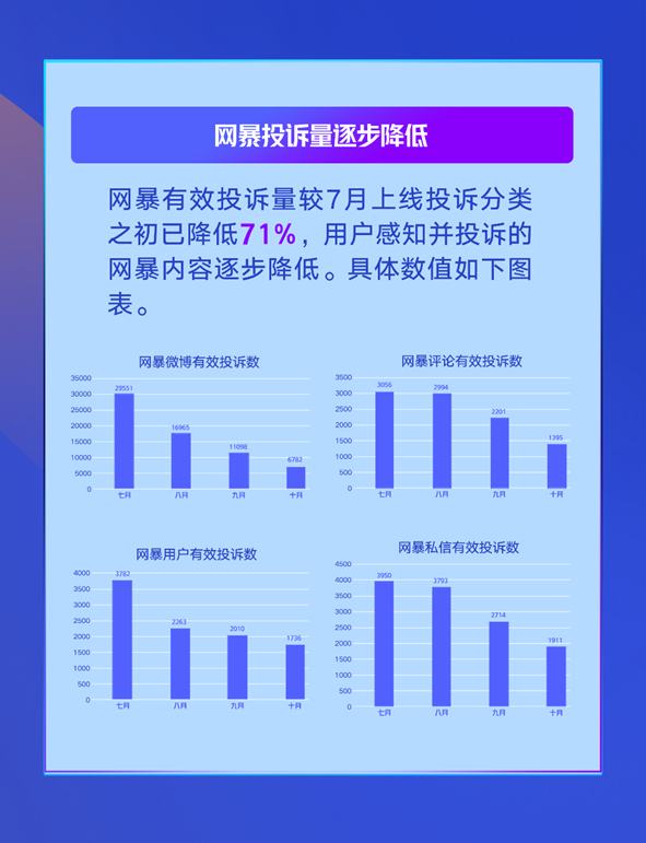 今年7月以來,微博網(wǎng)暴投訴分類下的用戶投訴量逐月降低。截至10月底,網(wǎng)暴有效投訴量相較7月已降低71%,用戶感知并投訴的網(wǎng)暴內(nèi)容逐步降低。