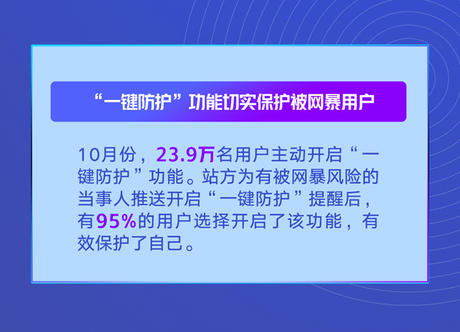 10月份,微博有23.9萬名用戶主動(dòng)開啟“一鍵防護(hù)”功能。微博為有被網(wǎng)暴風(fēng)險(xiǎn)的當(dāng)事人推送開啟“一鍵防護(hù)”提醒后,有95%的用戶選擇開啟了該功能,有效保護(hù)了自己。