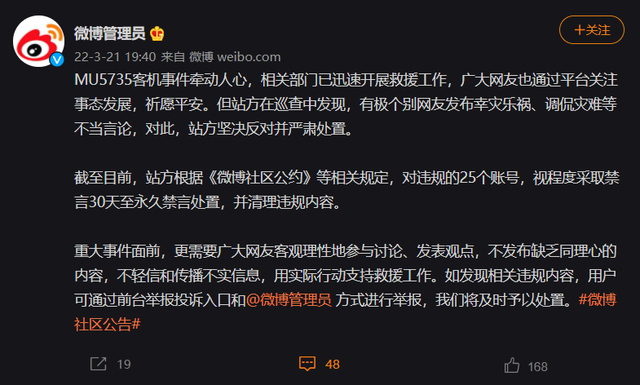 3月21日,“微博管理員”表示, MU5735 客機(jī)事件牽動(dòng)人心,相關(guān)部門(mén)已迅速開(kāi)展救援工作,廣大網(wǎng)友也通過(guò)平臺(tái)關(guān)注事態(tài)發(fā)展,祈愿平安。但站方在巡查中發(fā)現(xiàn),有極個(gè)別網(wǎng)友發(fā)布幸災(zāi)樂(lè)禍、調(diào)侃災(zāi)難等不當(dāng)言論,對(duì)此,站方堅(jiān)決反對(duì)并嚴(yán)肅處置。
