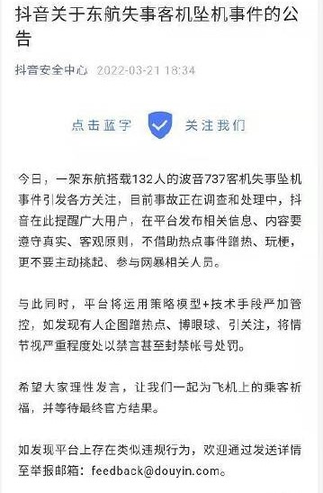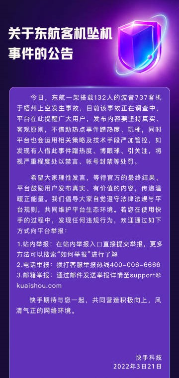 此外,快手、抖音等也都發(fā)布了關(guān)于 MU5735 客機(jī)事件的相關(guān)公告,對(duì)于借此事件蹭熱度、博眼球、引關(guān)注,將視嚴(yán)重程度處以禁言、帳號(hào)封禁等處罰。
