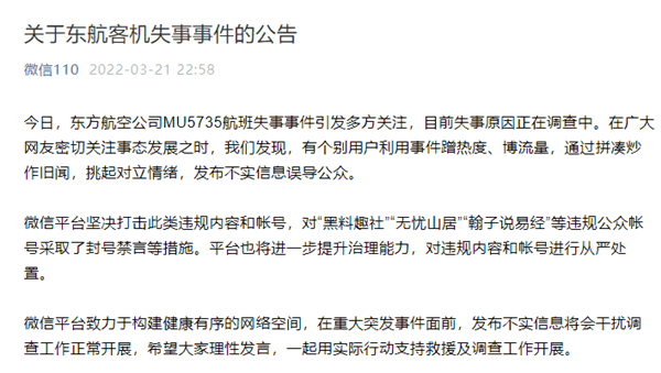 3月21日,據(jù)“微信110”公眾號(hào)消息,東方航空公司MU5735航班失事事件引發(fā)廣泛關(guān)注,目前失事原因正在調(diào)查中。在廣大網(wǎng)友密切關(guān)注事態(tài)發(fā)展之時(shí),平臺(tái)發(fā)現(xiàn),有個(gè)別用戶利用事件蹭熱度、博流量,通過(guò)拼湊炒作舊聞,挑起對(duì)立情緒,發(fā)布不實(shí)信息誤導(dǎo)公眾。