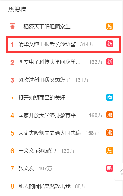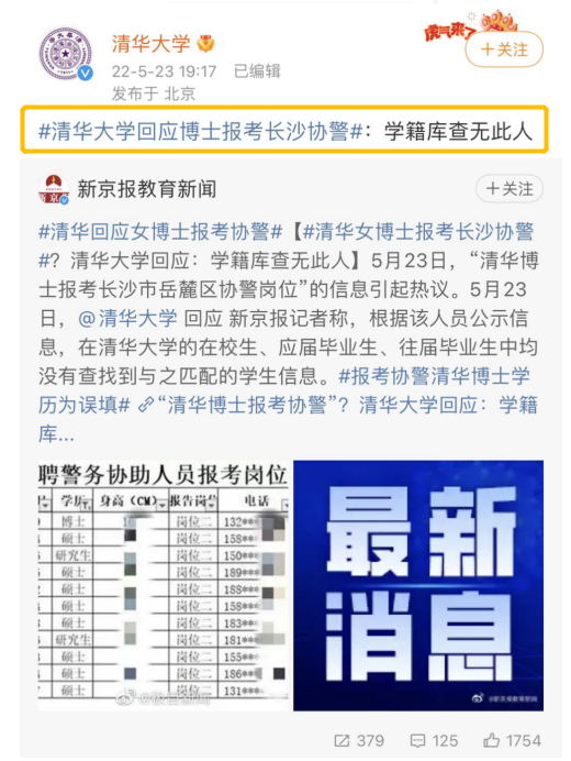 5月23日,有關(guān)“清華博士報(bào)考長(zhǎng)沙市岳麓區(qū)協(xié)警崗位”的網(wǎng)上消息引發(fā)關(guān)注,并沖上微博熱搜。有媒體報(bào)道稱,近日網(wǎng)友爆料,有清華博士生報(bào)考長(zhǎng)沙市岳麓區(qū)協(xié)警崗位。據(jù)岳麓區(qū)人民政府官網(wǎng)5月21日公布的《岳麓區(qū)2022年招聘警務(wù)協(xié)助人員報(bào)考審核通過名單公告》顯示,在通過“警務(wù)協(xié)助人員崗位二”審核的人員表格中,出現(xiàn)了眾多高學(xué)歷人員,其中最高學(xué)歷為一位1994年出生的張姓女博士(特長(zhǎng)備注為“清華大學(xué)”)。